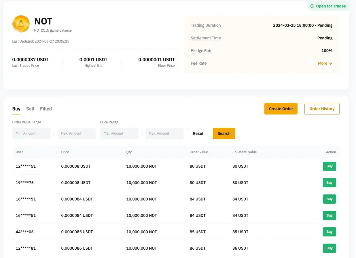 3 月初,Notcoin 推出了一项功能,允许精英玩家将大量游戏内货币转换为 NFT 代金券,这些代金券可以在其代币正式发行之前进行交易。玩家可以选择用 1000 万或 1 亿游戏币换取优惠券 NFT。当前该 NFT 已上线 TON 生态 NFT 交易平台 Getgems 进行提前交易和定价,当代币正式在链上发行后,NFT 可兑换为代币。