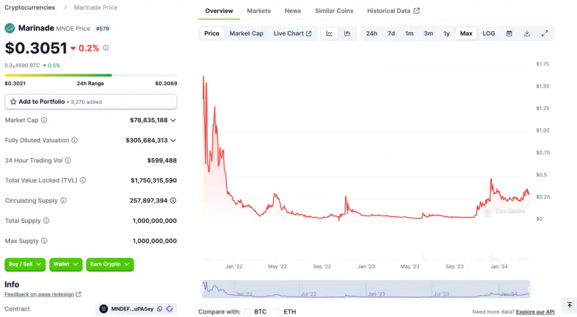 作为在 Solana 链上最早的质押协议,Marinade 历史上 SOL 最大质押量约为 900 万枚,随后陆续受到 Lido 以及 Jito 等质押平台上线的冲击,业务长期维持在相对稳定水平。营销能力相对一般,因此市场关注度一直较低。