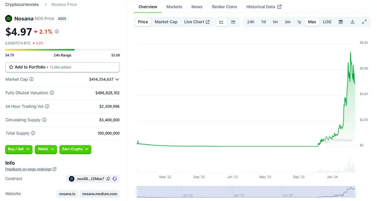 NOS 代币总量 1 亿枚,当前市值 4.1 亿美金,流通量达到 83%。上线的主流交易所包括 Gate、MEXC。流动性主要集中在 Raydium。