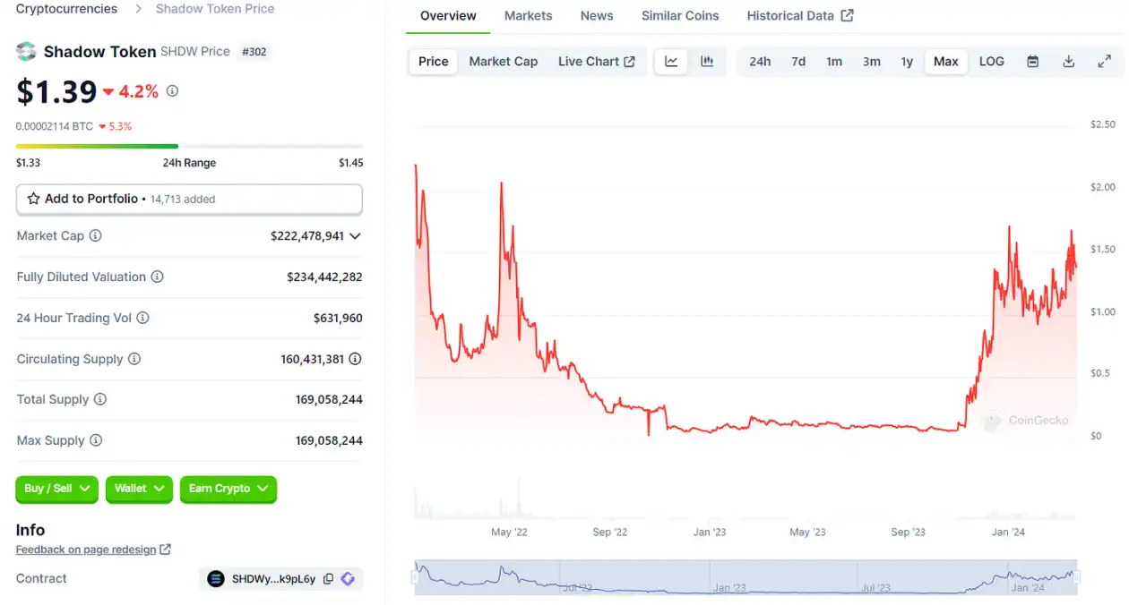 SHDW 代币总量 1.69 亿,当前流通量已达到 96%,市值 2.2 亿美金,FDV 为 2.3 亿美元。目前尚未在主流中心化交易所上线,流动性主要集中在 Raydium。