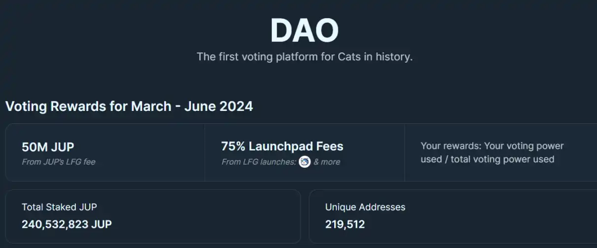 Jupiter 计划将 1 亿枚 JUP 代币和 75% 的 launchpad 费用分配给质押者。依据 Jupiter DAO 历史数据显示,首轮(3 月 -6 月)投票中已有 2.2 万个钱包地址约 2.4 亿枚代币进行质押,此次有 5000 万枚代币和其他 Launchpad 费用(包括 75 亿枚 WEN)投入分发,另外 5000 万枚将在下个季度使用,也就意味着 JUP 首轮(90 天)质押收益率至少可达到 84%(0.5/2.4/90*100%*365)。