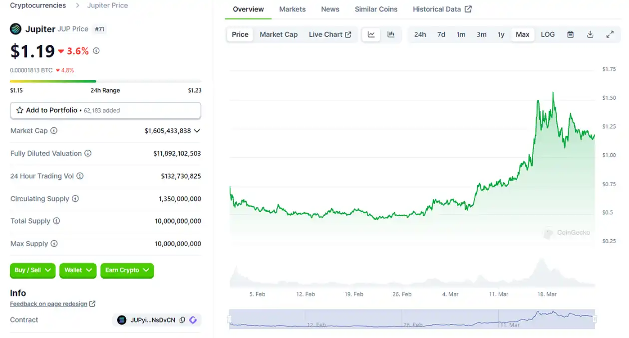 当前市值 16.05 亿美金,上线的主流交易所包括 Binance、Gate。JUP 流通量为 13.5 亿,首轮投票质押了 2.4 亿枚代币,相当于锁住了 18% 的流动性,市场流通的筹码更加少。在高收益率和降低流通量的螺旋作用下,有可能会进一步推动 JUP 代币价格的上涨。