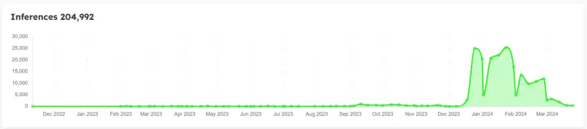 依据 Nosana 浏览器数据显示,2023 年 12 月中旬至 2024 年 3 月,Nosana AI 推理呈现较为强劲的需求。