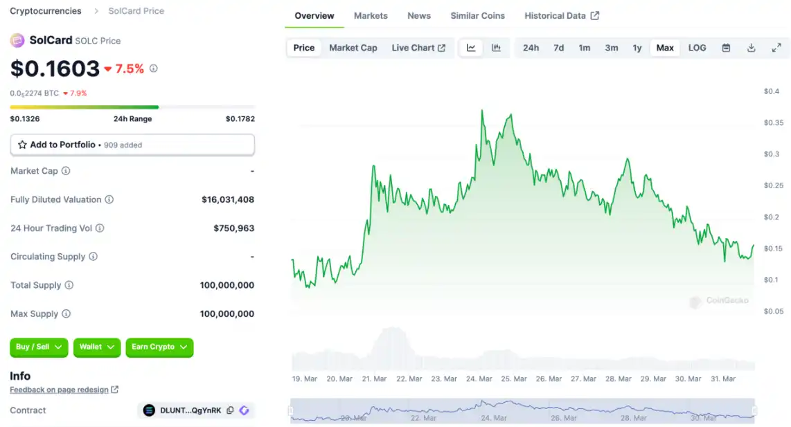 简介:solcard 是支持 SOL 充值、无 KYC 的加密虚拟卡,该加密虚拟卡支持网上购物。Solcard 对每笔用户存款收取 5% 的手续费,并且计划将收取费用的 50% 返还给 SOLC 代币持有者。微信支持 Solcard 绑定支付促使其价格拉涨。