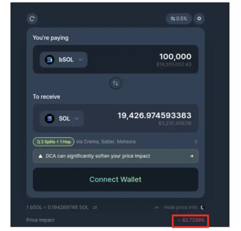 流动性不足时,你的利益也会受损。下图是一个例子,在一个不好的流动池中,将 LST(bSOL)兑换成 SOL 时,如果坚持兑换,会造成 82% 的财产损失。