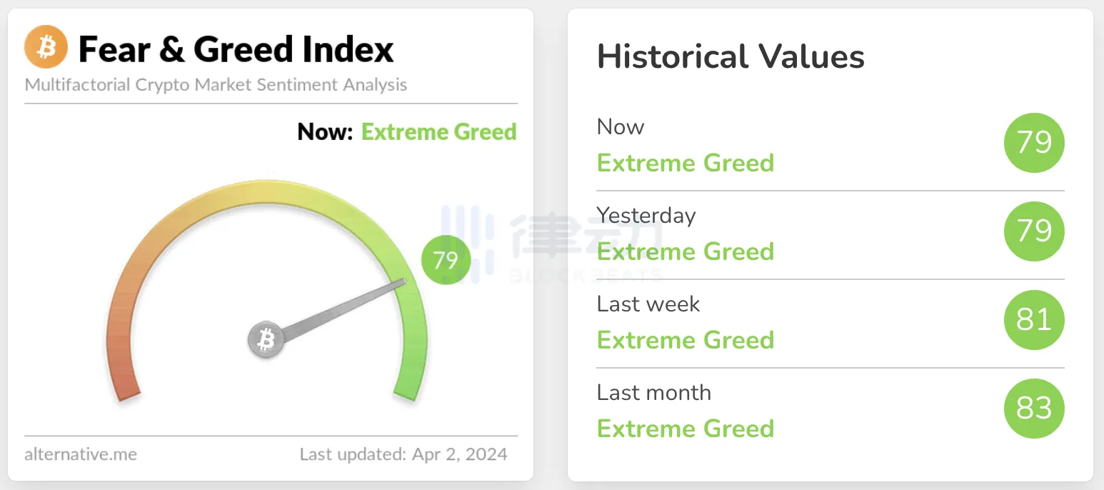 尽管大盘普跌,但 24 小时跌幅大多维持在 5%-10% 之间,整体看涨的市场情绪并未收到影响。据 Alternative 数据显示,今日加密货币恐慌与贪婪指数为 79,上周指数为 81,市场仍处于极度贪婪情绪,并未出现降温变化。