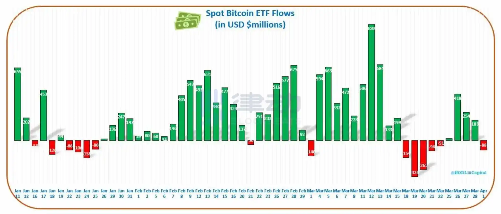 BlcokBeats报道,4 月 2 日,据 HODL15Capital 数据,昨日比特币现货 ETF 整体净流出 8800 万美元,其中,IBIT 净流入 1.64 亿美元,灰度 GBTC 净流出 3.03 亿美元。而据 Farside Investors 数据,ARKB 也首次出现净流出状态,流出量为 30 万美元。