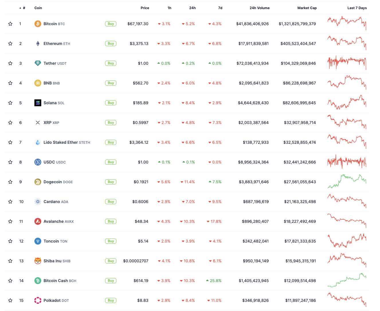今日,比特币在 20 分钟里从 69,000 美元跌至 67,000 美元以下,现报价 66,673 美元,24 小时跌幅为 5.64%。以太坊跌破 3400 美元,现报价 3362 美元,24 小时跌幅达 6.91%。BNB、SOL、AVAX 跌幅分别为 7.0%、9.1% 和 10.8%。