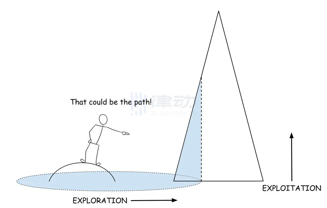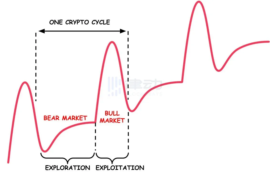 让我们简要讨论探索/开发的博弈论。加密货币周期有两个阶段,一个阶段是人们被迫提出看似新颖的事物,另一个阶段是人们利用这些新事物,并夸大叙事来进行开发。