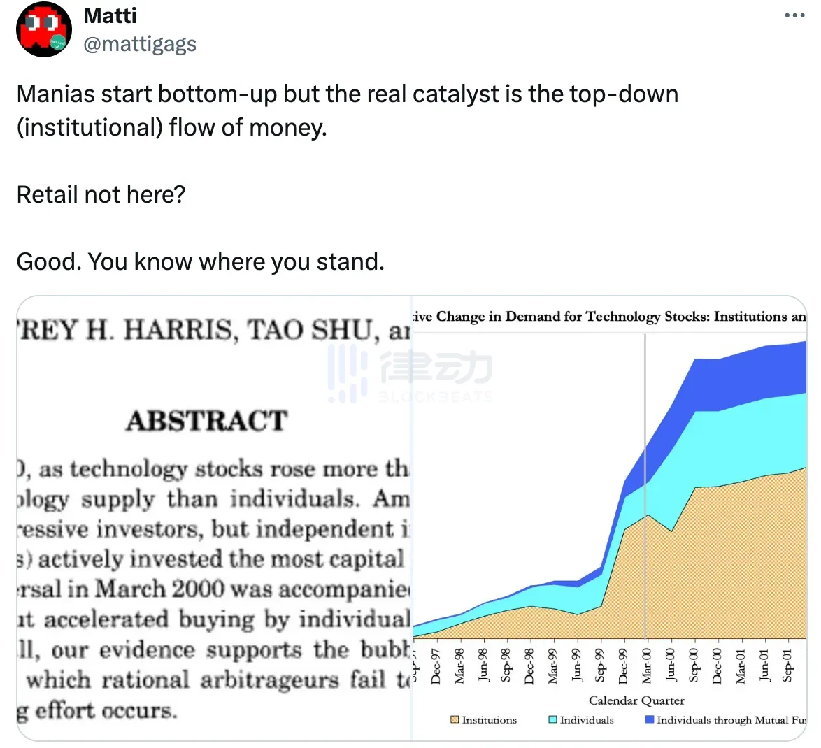 这次上涨是由机构资本的自上而下流动开始的,没有真正闪亮的新东西。潜在的即将到来的狂热基础是机构资金的流入(和信用?)以及价格行动本身。这个周期是否会因为机构资金过度暴露而灭亡?