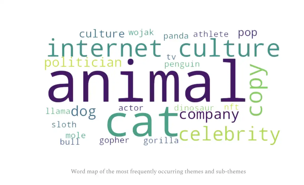 可以看出,以动物为主题的代币是最热门的,其中猫是最受欢迎的子主题。图中的第二大子主题是「互联网文化」,通常包含加密 Twitter 和主流 Meme。