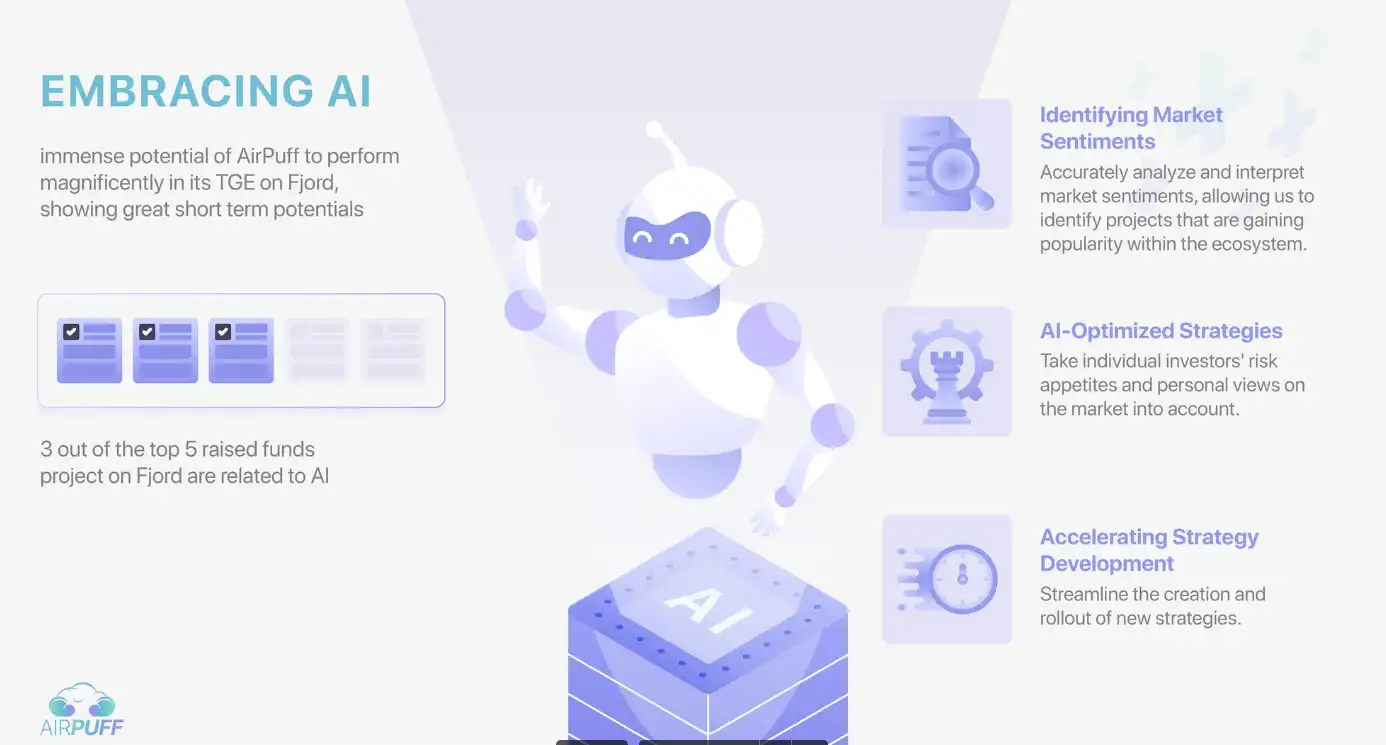 AirPuff 的下一个阶段会是把 AI 技术融入到空投策略之中。AirPuff 透过运用人工智能技术分析市场动向和空投资讯,协助用户把握即时、浓缩并准确的空投机会,更有效的在有限的资金内最大化用户的空投收益。另外,AirPuff 也会融入人工智能到策略设计上,使人工智能能按照用户的风险取向和资产分佈作出分析,为用户建议最合适的空投策略。把人工智能融入到产品设计也能更有效的缩短产品研发和推出时间,使 AirPuff 能更快捷的捕捉市场的热点,提供适切的支援。