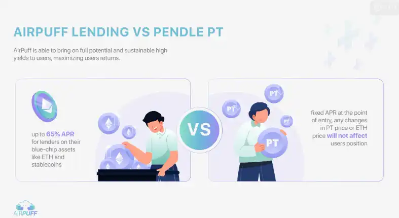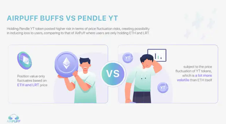 使用 AirPuff 策略比持有 YT 所承受的价格风险较细。用户使用 AirPuff 的策略,仓位的本位会是以 ETH 或稳定币作单位。相较于 Pendle 的 YT,YT 的价格会较为浮动,风险较大。YT 的价格会按市场预期的隐含利率 (Implied Yield) 而改变,因此价格波动较大。除此以外,YT 的价格在大部分情况下会随着靠近到期日而下降,因为预期所获得的利润已时日无多。因此 YT 的持有者须承受因 YT 价格下降而蒙受损失的风险。相比之下,AirPuff 以 ETH 或稳定币作本位所承受的风险就较细。