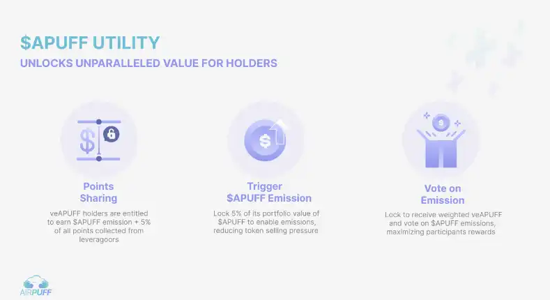 $APUFF 代币作为 AirPuff 的治理代币,将会成为 Airdrop 界的 Celestia,提供一个底层协议供所有 Airdrop 在这之上建立。用户能透过锁仓代币而获得主要三个用途:空投分成、额外$APUFF 分发和控制$APUFF 派发的投票权。