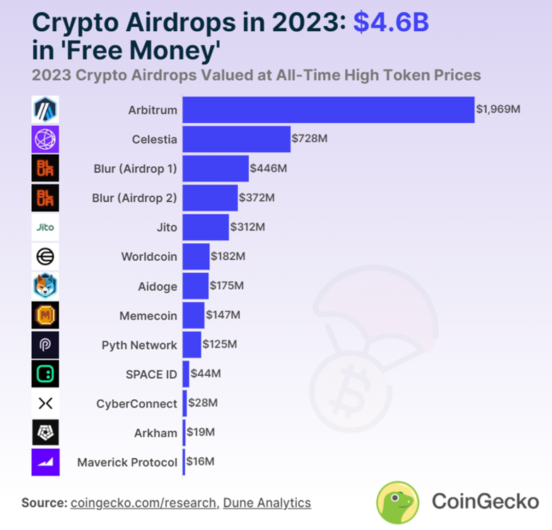 众所周知,空投活动已在近年来越趋普及。项目透过空投活动作为获取市场关注的主要策略。对于用户来说,空投,曾经被认为是一种简单的善意表示,现已成为财富和机遇的重要来源。单单在 2023 年,Defi 上的总空投份额高达 46 亿美元,而市场期待 2024 获得的空投将更会几何级上升,囊括多个蓝筹项目如 EigenLayer、各种 liquid restaking 生态的项目、Ethena、各种明星 L1 L2 链的自理代币等,使 2024 成为空投的重要一年。