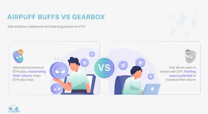 AirPuff 的 15 倍杠杆和稳定币借贷为用户提供更高的弹性。Gearbox 的杠杆产品只允许用户开启最高 10 倍的 ETH 借款。相较之下,AirPuff 允许用户开启最高 15 倍的杠杆,更能借稳定币作为额外的 ETH 多头仓位,为用户带来更大的获利潜力。