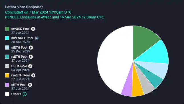 Pendle 从 YT 产生的所有收益中收取 3% 的费用。目前,该费用 100% 分配给 vePENDLE 持有者,而该协议不收取任何收入。除此之外,vePENDLE 投票者还有权从投票池中获得 80% 的利率互换费用,这构成了投票者的 APY。上图就是最新的投票情况,crvUSD pool 占据大约 44% 的投票权集中在这个池子。而截止 2024 年 3 月 7 日,目前锁定在 Pendle 上的总共有 4952 万枚,vePendle 作为一种投票权和权利的虚拟代币,共有 3276 万枚,平均锁定了 421 天。