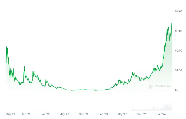 目前从币价涨势来看,其币价增长也符合 Staking 赛道的发展现状。目前币价已经到达历史新高的位置,但是其市值也才 3 亿美元(币价 3.11),全流通大约 8 亿美元,在 2025 年 5 月,由于释放机制的问题,FDV 实际上只能算 3 亿美元,因此我们认为该代币可能存在极大的上涨空间。