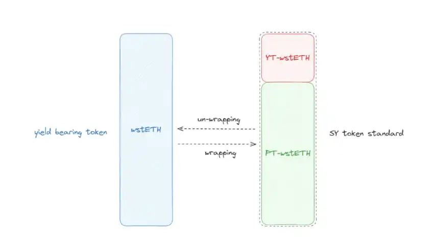 Pendle 创新性的将收益资产代币化成 SY 代币,其根据 ERC-5115: SY Token 标准进行的代币化,如将 stETH 包装成 SY-stETH,之后 SY 被分为其本金和收益成分,分别为 PT(Principal Token,本金代币)与 YT(Yield Token,收益代币)。