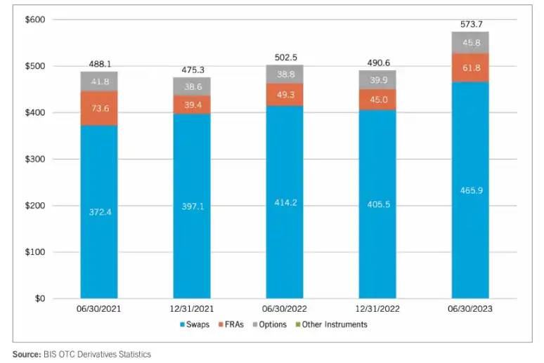 在 TradeFi 中,利率衍生品是在衍生品市场中占据市场大部分的头寸。并且,随着 TradeFi 的发展,衍生品市场的整体规模也在逐渐增大,截止 2023 年 6 月,整体衍生品市场的头寸已经达到了 714.7 万亿美元,而其中利率衍生品未平仓头寸达到了 573.7 万亿美元,占据了 80.2% 的份额。