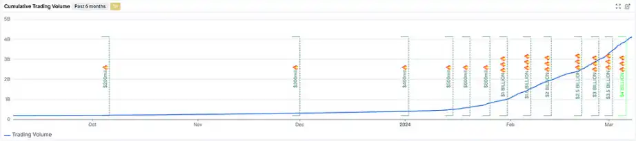 在 Pendle 协议上的交易笔数、交易量也呈现非常正向的逐渐增高,这意味着市场随着 LSD、LSDFI、LRT、Restaking 等 DEFI 项目的发展,市场对于利率衍生品的需求逐渐增加。并且截止于 2024 年 3 月 7 日,其累计交易量也突破 40 亿美元,并且其趋势是逐渐增多。