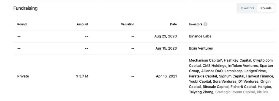 该项目的主要投资人包括 Mechanism capital、HashKey、Bixin Ventures、Binance Labs 等。