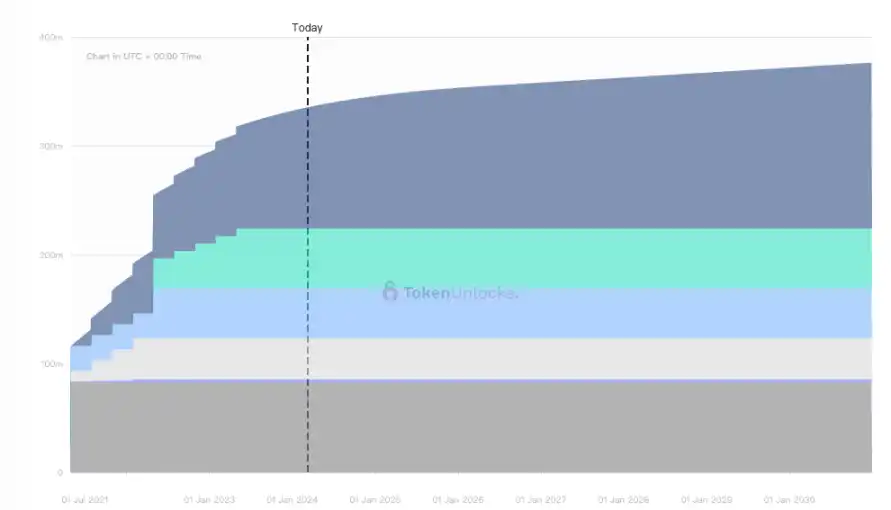 流动性激励预计持续到 2030 年末,官方假设年通胀率为 2%,每周下降 1.1%,直至 2026 年 4 月。该代币的释放图如上图所示,我们预计在大约在 2025 年 5 月 1 日作为截止日期,其大约会流通 2.7 亿枚,整体来说增长不多,对牛市的代币价格没有什么影响。