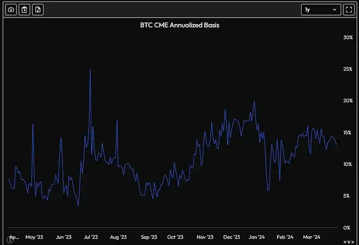 也许还有理由相信资金费率将长期保持结构性正向。一些交易所(Binance、Bybit)的基准资金费率为 11%,这意味着如果资金费率在一定范围内,它会默认恢复到 11%。这些交易所占持仓量的 50% 以上。甚至当我们研究 TradFi,CME 比特币期货也比币安更大,目前的差额约为 15%。一般来说,作为资本成本的代理指标,期货收益率基差在绝大多数时间内为正值。