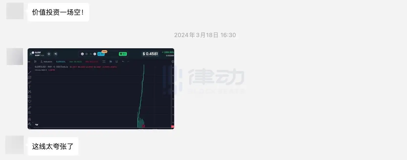 赛程过去 1/3,错过了 BOME 的 0xnoc 开始吐槽「费劲开什么合约呀」。随后 SLERF 出现在消息流中,0xnoc 迅速买入,并称「价值投资一场空!」SLERF 之后,0xnoc 的 100U 终于翻了三倍。