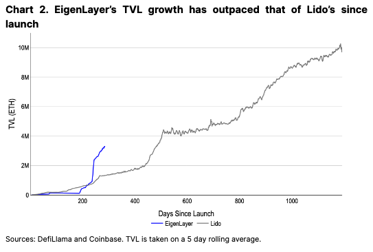 到目前为止,EigenLayer的TVL增长惊人,仅次于Lido(以太坊领先的流动性质押协议)。EigenLayer 实现了这一目标,同时保留了大部分流程的存款上限,并且还在启动任何实时 AVS 之前。也就是说,将持续的再质押需求与用户对短期积分和空投的兴趣分开是困难的。虽然随着协议成熟,再质押的以太坊的数量可能会在长期内继续增长,但我们认为,当积分挖矿结束或早期 AVS 奖励低于预期时,TVL 可能会出现短期下降。
