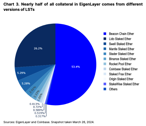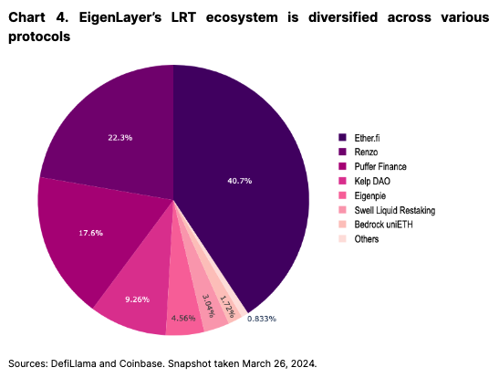 从LST的流行中学习,一个丰富的LRT生态系统已经发展起来,有超过六种协议提供具有各种积分和空投方案的流动性再质押代币版本。在EigenLayer中保护的300万个以太坊中,大约有210万(62%)被二级协议包装。我们之前已经见识到了流动性质押市场中类似的模式,并相信随着该行业的发展,替代方案的多样化将非常重要。