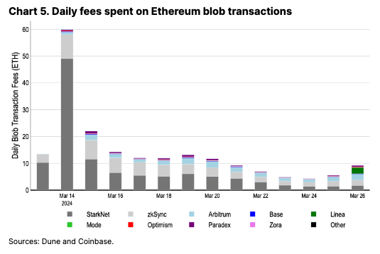 为了估算EigenDA的初始收益,我们可以将其与以太坊blob存储成本进行比较。目前,许多主要L2每天约花费10个ETH进行blob交易,包括Arbitrum、Optimism、Base、zkSync和StarkNet(见下图)。如果 EigenDA 看到类似的使用水平,根据我们保守的估计,每年再质押奖励的年化率约为3500个ETH,相当于额外奖励的约 0.1%。我们认为,尽管增加多个 AVS 可能会迅速增加收益,但前几个月的费用可能会低于预期。