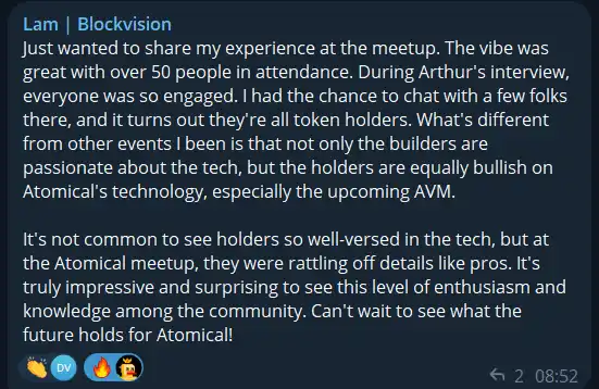 据外国社区参会者的反馈,聚会现场气氛很好:「与我参加的其他活动不同的是,不仅建造者对技术充满热情,而且持有者也同样看好 Atomical 的技术,尤其是即将到来的 AVM。」