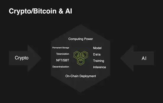 除了比特币本身相关的动态,AI 与 Crypto 的结合也是最近行业内关注的重点,目前,我们看到从技术面发展上分析可能有以下几个结合点: