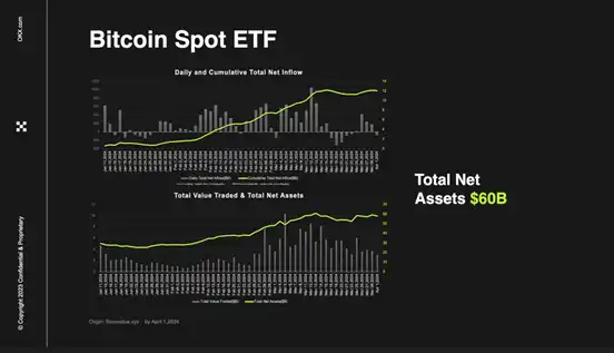 当然,除生态进展外,今年的 BTC 现货 ETF 上市更是行业的里程碑事件。年初美 SEC 终于批准了比特币现货 ETF 上市。截止 4 月 1 日,比特币现货 ETF 日均净流入资金量 2.19 亿美元,日均交易量已为 33.7 亿美元。