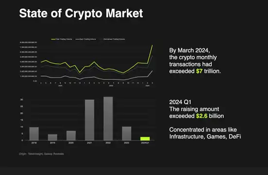 而且,对比世界银行公布的 2022 年数据来看:美股总交易量为 43.22 万亿美元,加密货币交易量已与其处于同一水平。其次,从加密市场投融资角度来看,经历了 2021 年、2022 年的疯狂,2023 年的市场投资总额回落到 100 亿美元左右。投资的领域主要聚焦在基础设施、游戏、DeFi 等领域。2024 年一季度的投融资总额超过 26 亿美元,对比历史数据,暂处于一个温和状态。