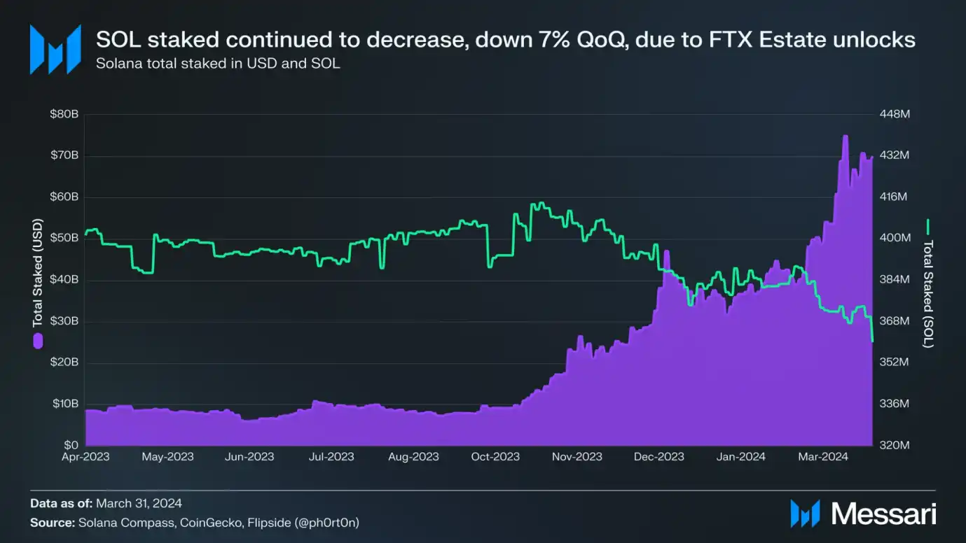SOL 市值继续处于市场的领先地位。其市值在所有代币中排名第五,仅次于 BTC、ETH、USDT 和 BNB。在上一个周期达到 770 亿美元的峰值后,SOL 市值继续达到历史最高水平。截至 24 年第一季度,市值为 864 亿美元,环比增长 97%。然而 SOL 距其近 260 美元的历史高点还有约 25% 的差距。