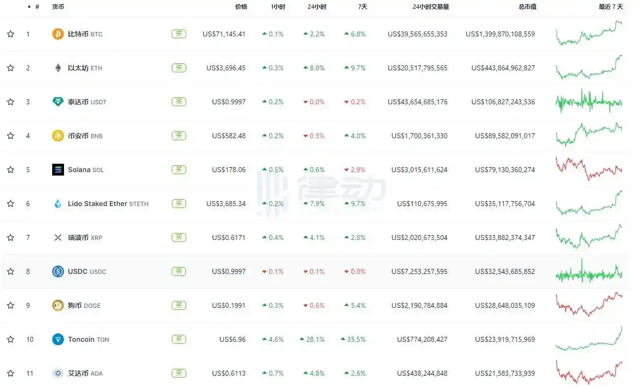 3. TON 市值超越 ADA,成为第 10 大市值加密货币;