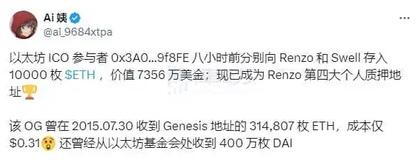 据 @ai_9684xtpa 监测,某以太坊 IC0 参与者 8 小时前分别向 Renzo 和 Swell 存入 10,000 枚 ETH,价值 7356 万美元,其现已成为 Renzo 第四大个人质押地址。据悉,该 OG 曾在 2015 年 7 月 30 日 收到 Genesis 地址的 314,807 枚 ETH,成本仅 0.31 美元。