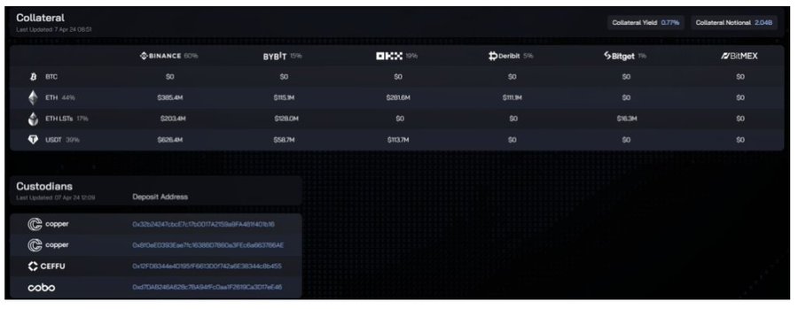 我们回到Ethena,关于是使用交割合约还是永续合约我并没有在官网找到准确界定(考虑到交易深度问题,永续合约的概率比较大),但公布了抵押物的链上地址和CEX分布。