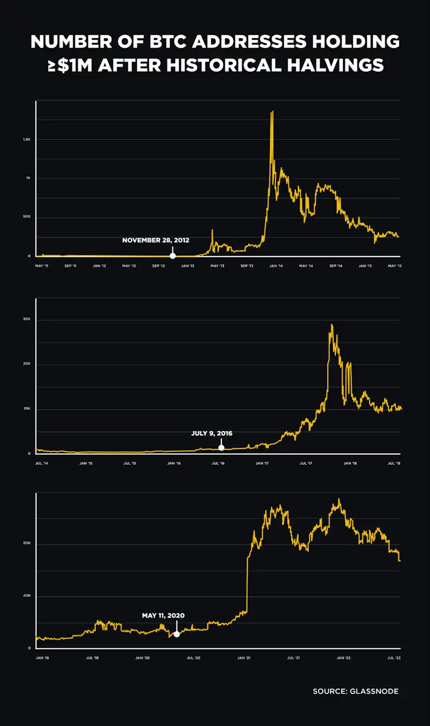 除了与价格相关的影响和更多的关注 ( 部分是通过这些影响 ) 之外,减半还与采用指标的深刻、长期增长有关。比特币在减半前和减半后的知名度提高,刺激了更多的新来者探索并可能购买数字货币,从而有助于扩大其用户群。