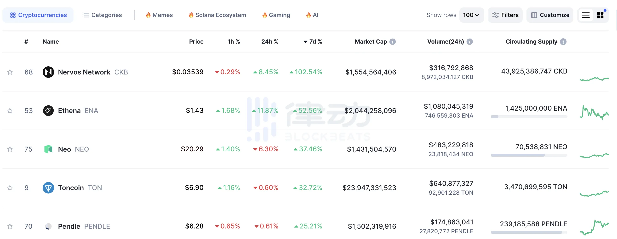 近几日,Nervos CKB 代币 CKB 的涨幅十分亮眼,CKB 在今日突破 0.035 美元,24 涨幅 8.98%。在 CoinMarketCap 上,CKB 以 102% 的周涨幅排名第一,远超 ENA、TON 等热门项目代币。