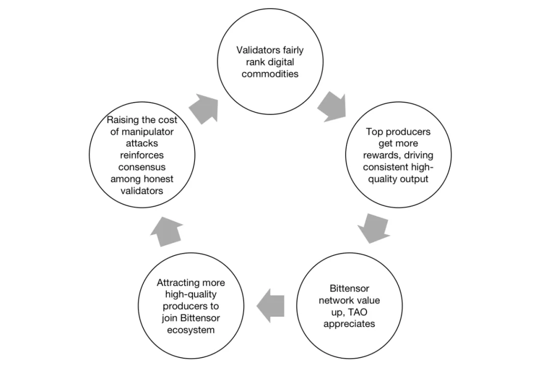 Bittensor 通过一个飞轮模型实现了这个目标。验证者评估生态系统中人工智能产品的质量,并根据其质量分配激励,确保高质量生产者获得更多的激励。这激发了高质量产出的持续增加,从而增强了 Bittensor 网络的价值并促进了 TAO 的增值。TAO 的增值不仅吸引了更多高质量的生产者加入 Bittensor 生态系统,而且增加了操纵质量评估结果的操纵者的攻击成本。这进一步加强了诚实验证者的共识,增强了评估结果的客观性和公平性,从而实现了更有效的竞争和激励机制。