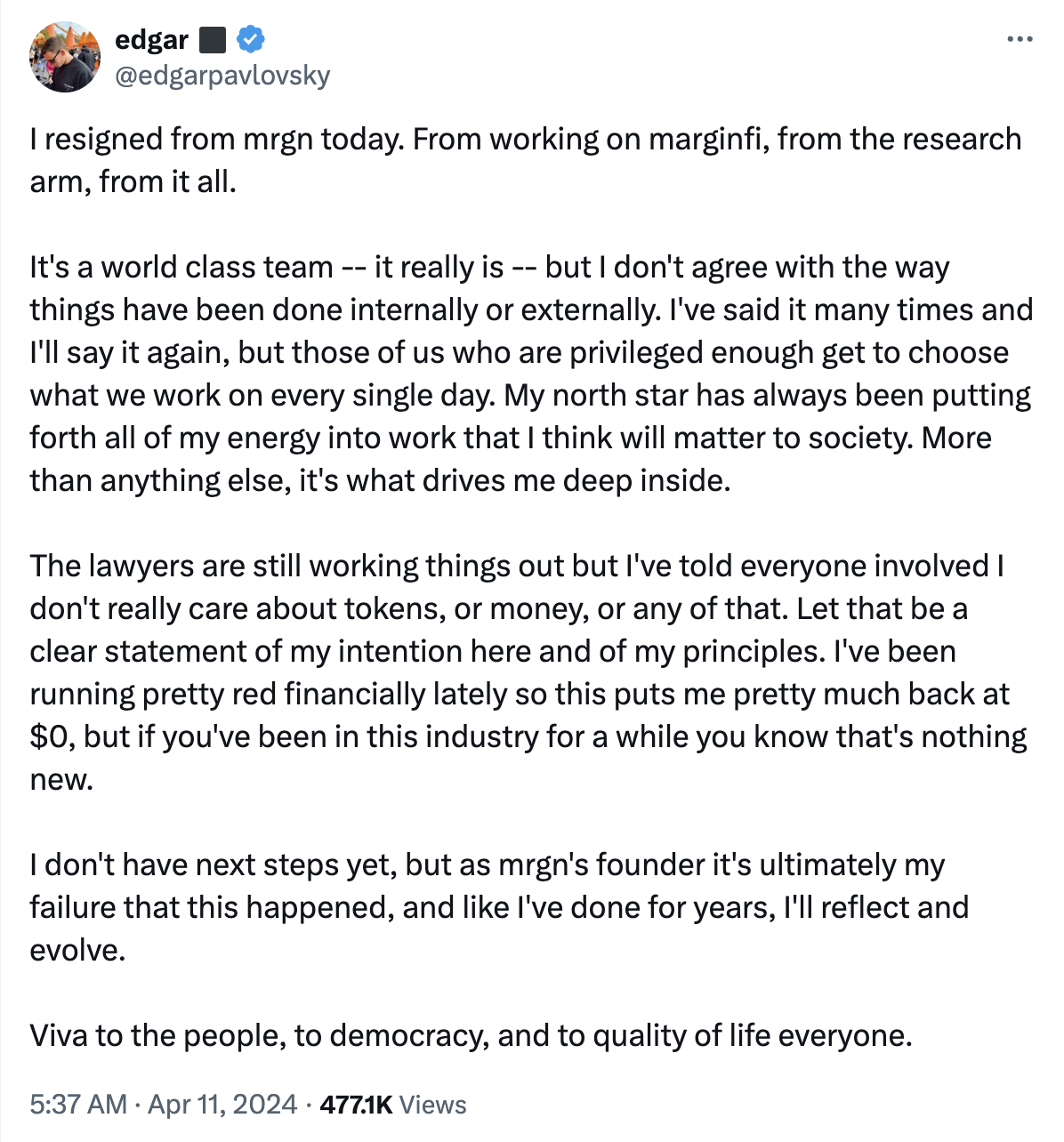 今早,Solana 生态保证金协议 Marginfi 创始人 Edgar Pavlovsky 在社交媒体上发文宣布其已从 Marginfi 团队离职,离职原因是对团队内部或外部的做事方式不能苟同。