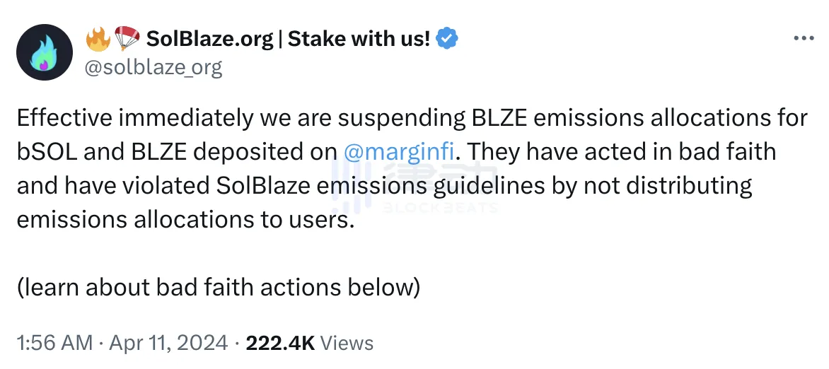 SolBlaze 是 Solana 上的 LST 项目,其于昨晚指控 Marginfi 操纵 BLZE 排放分配,导致用户造成损失。「在过去的三个排放周期(三周)中,marginfi 未能将分配的 BLZE 排放加载到其奖励系统中供用户领取,并且从排放分配发送的 BLZE 只存在于其团队的多重签名中」,因此,SolBlaze 宣布暂停存储在 Marginfi 上的 bSOL 和 BLZE 的排放分配,立即生效。