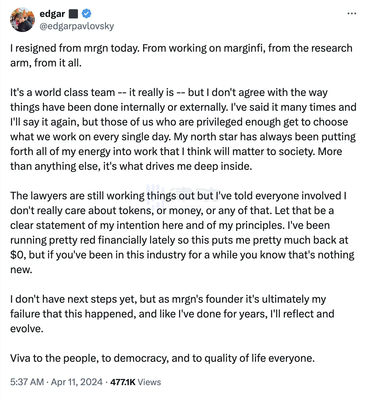 今早,Solana 生态保证金协议 Marginfi 创始人 Edgar Pavlovsky 在社交媒体上发文宣布其已从 Marginfi 团队离职,离职原因是对团队内部或外部的做事方式不能苟同。