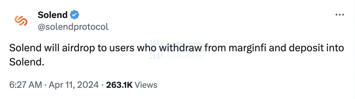 在 Edgar 发文一小时后,Solend 官方宣布将空投给从 Marginfi 提款并存入 Solend 的用户,具体空投数量将与用户转移的美元价值成正比,资金必须存放一段时间才有资格。