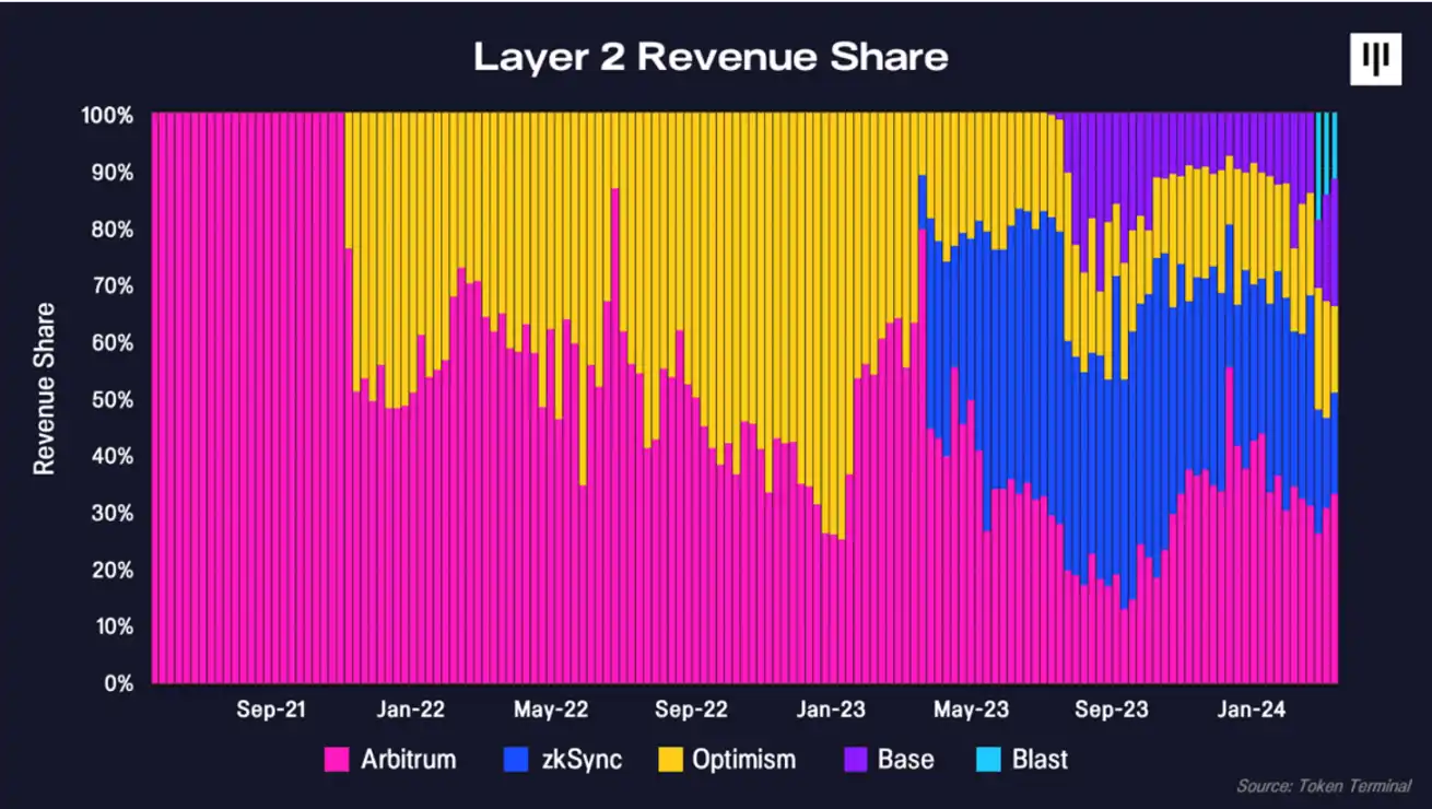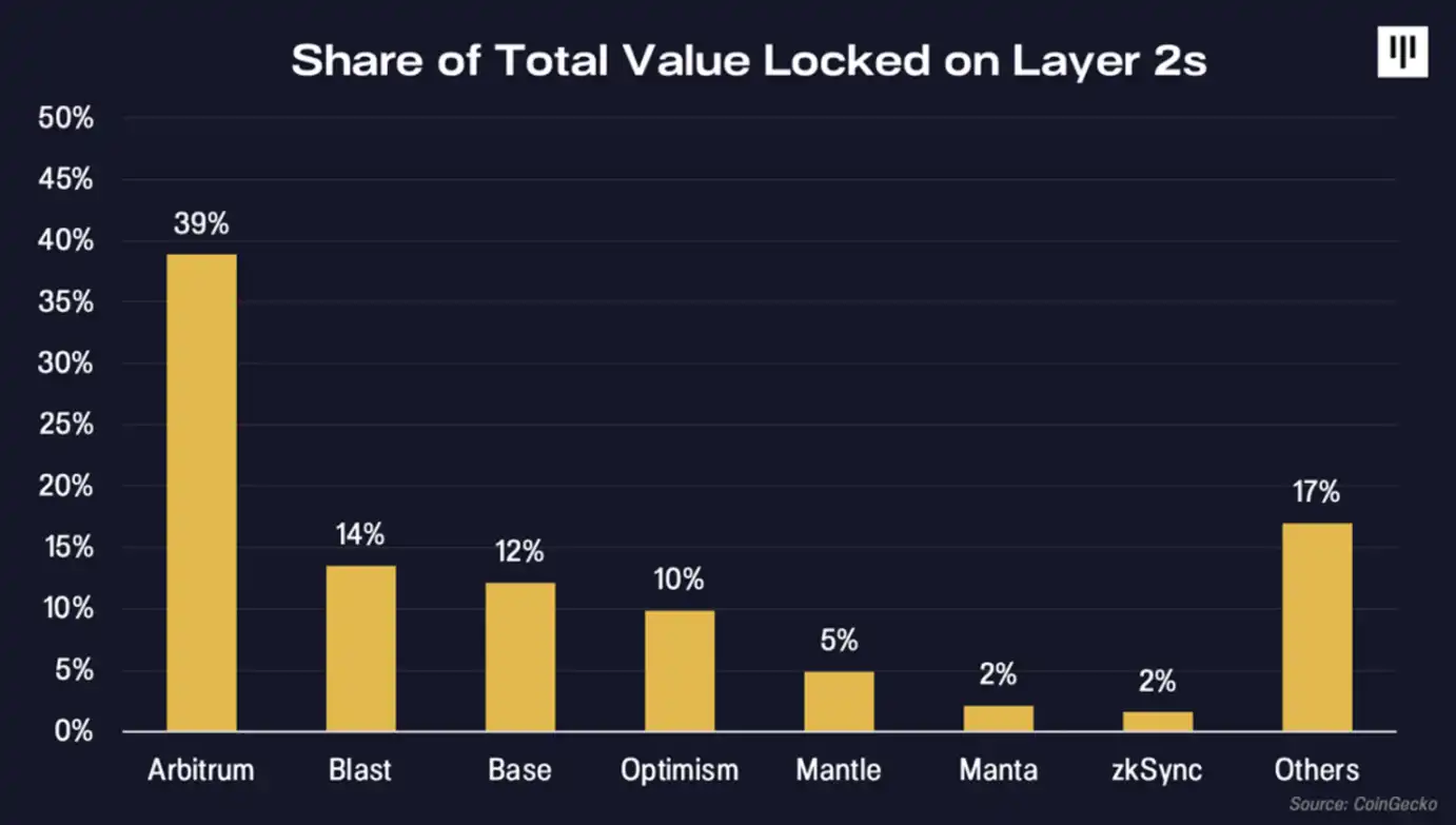 TVL 衡量的是存入区块链以支持流动性或借贷活动的资产价值。L2 rollup TVL 有 39% 位于 Arbitrum 中。Arbitrum 在其 DeFi 协议中持有 40 亿美元,而紧随其后的竞争对手 Blast 则锁定了 14 亿美元。这一指标很有意义,因为 TVL 是交易活动、流动性和项目整体健康程度的指标。高 TVL 表明用户参与度高,对平台充满信心。