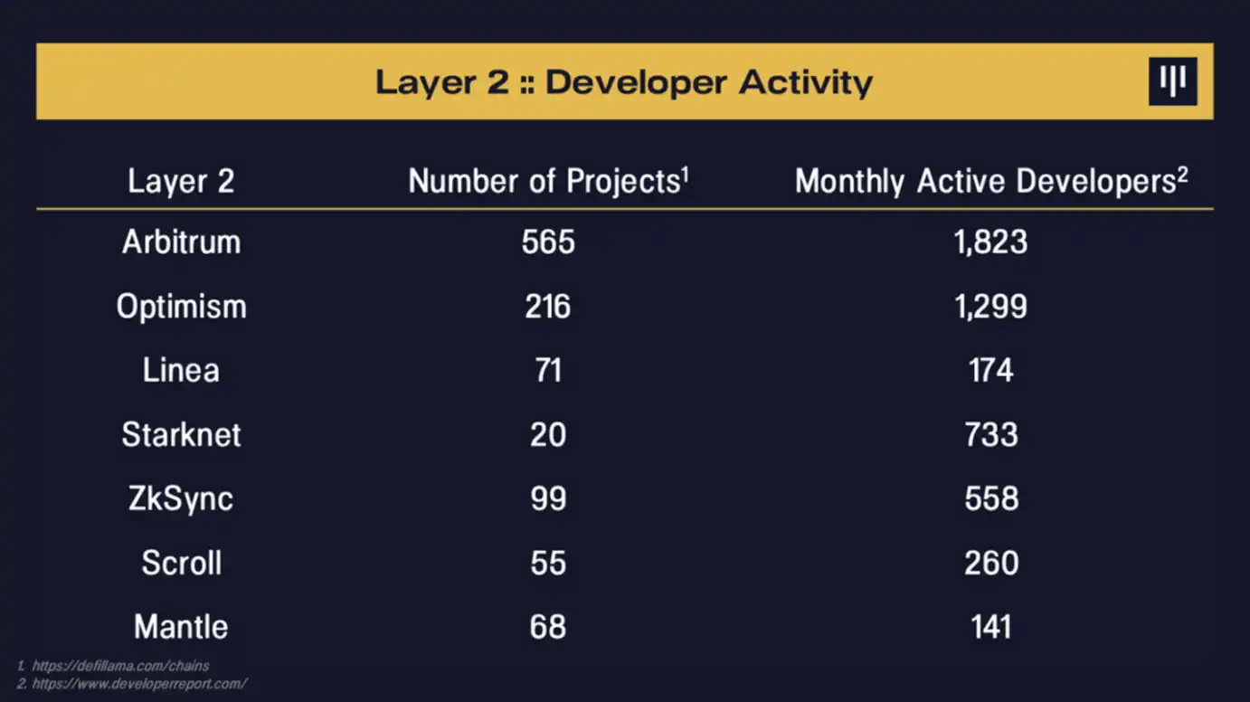 抛开目前的主导地位不谈,我们之所以相信 Arbitrum 有能力继续成为以太坊的首选扩展解决方案,是因为它专注于开发者活动。如上表所示,Arbitrum 为寻求部署去中心化应用程序的开发者构建了最具吸引力的平台。用户最终会倾向于最好的应用程序所在的生态系统,通过加倍努力开发者社区,我们相信 Arbitrum 正在确保其长期可持续性。
