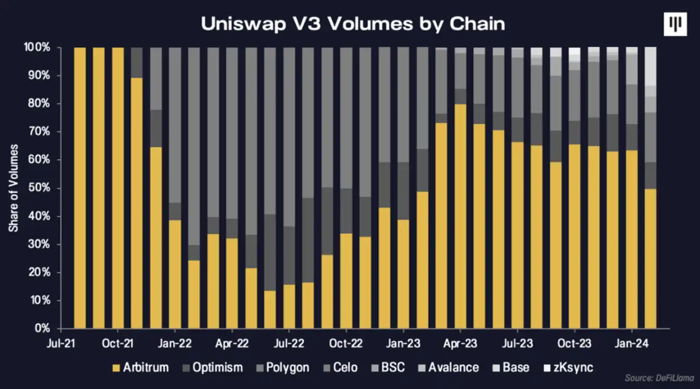 与其他 L2 扩展解决方案相比,Arbitrum 收入一直领先。其他链的创收能力会出现波动,尤其是在预期代币空投的情况下(如 zkSync 目前的情况),而 Arbitrum 社区的活动确保了可预测的收入,不受外部动态的影响。Arbitrum 通过开辟像 DeFi 这样的利基市场来做到这一点,他们在这里培育了像 GMX 和 Uniswap 这样的协议,这样他们就可以培育出作为 DEX 交换和 Perp 交易的首选链的品牌。